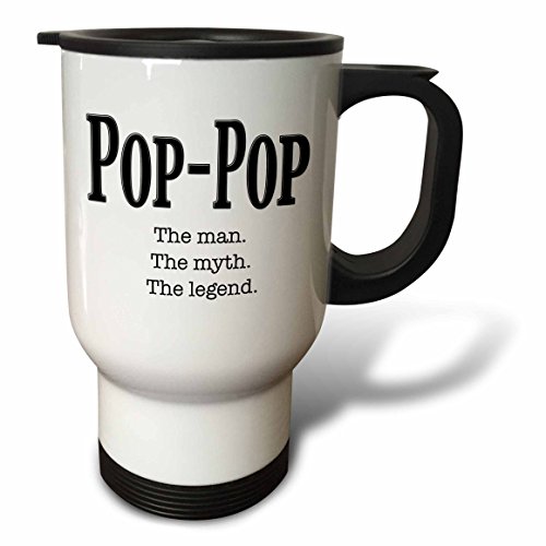 Pop-Pop the man the myth the legend. Grandpa. Grandfather. Travel Mug is a great way to take your favorite hot or cold drink along. With a tapered bottom this stylish 14oz mug fits in a standard cup holder and features an easy-grip handle with thumb rest, slide opening lid and slanted drinking surface. This travel mug is made of stainless steel. Not microwave safe, hand washing is recommended.Feature