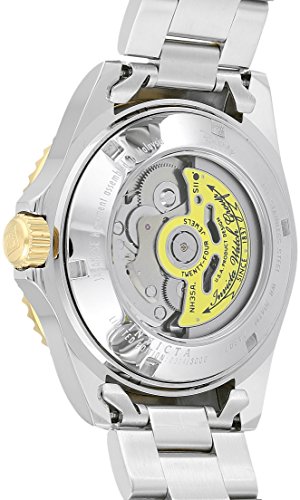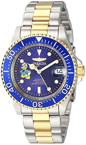 Invicta 24397 Disney Limited Edition men's automatic dive watch features a 40mm wide solid stainless steel case with a unidirectional rotating blue accented gold tone bezel and textured screw down crown. Invicta 24397 is powered by Japanese TMI NH35A automatic movement. This stylish watch also features a sharp looking shiny Donald Duck printed blue dial with white accents gold tone luminous hands and dot hour markers along with the date display function, scratch resistant mineral crystal and water resistant to 200 meters. Invicta 24397 is equipped with a 20mm wide two tone yellow gold plated solid stainless steel bracelet with a fold over safety lock clasp. Invicta 24397 men's Disney blue dial two tone bracelet automatic dive watch is brand new and comes in an original Invicta gift box and is backed by a 5 year limited warranty.Feature