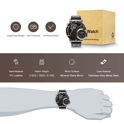 Brand, Seller, or Collection Name:Aposon Model number:AP-HP9591-Black Part Number:AP-HP9591-Black Item Shape:Round Dial window material type:Glass Display Type:Analog quartz Clasp:Buckle Case material:Stainless steel Case diameter:4.80 Case Thickness:0.99 Band Material:Leather Band length:10 INCH Band width:2.20 centimeters Band Color:Black Dial color:Black Special features:dual-Time-display Movement:Analog-Quartz
