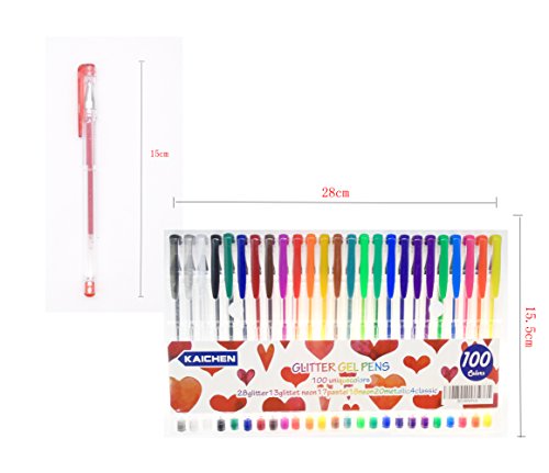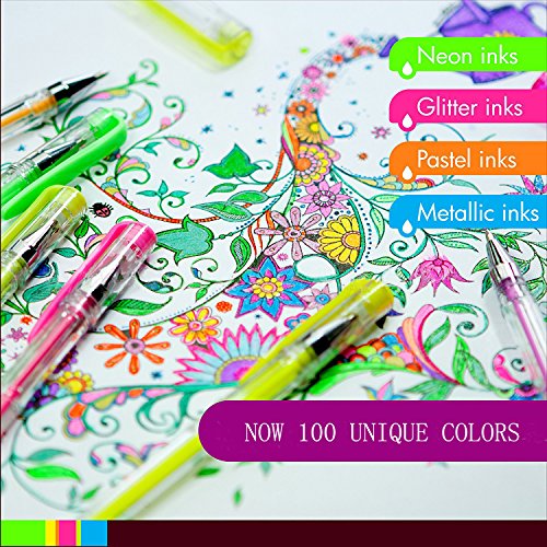 ASSORTED COLORS:100 unique colors gel pen set,lear and vibrant colors including glitter,glitter neon,pastel,neon,metallic,classic.Multiple colors become the garantee of your perfect works!