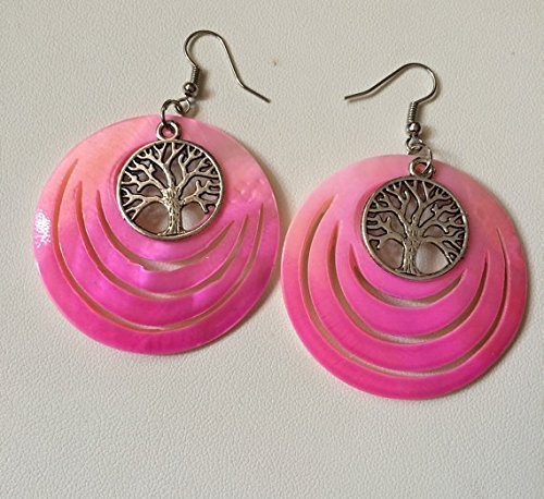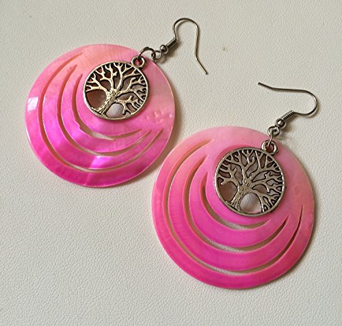-. Title : Pink mother of pearl shell & Tree of Life Charm Dangle Earrings
