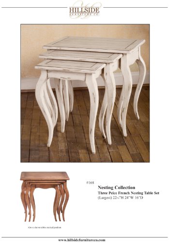 -. Feature : Nesting Table 3 tables in One / This Item is only listed in Windsor Brown Finish (an antiqued white finish with Dark wood showing through some areas to replicate wear and tear) / Nesting Tables by Hillside Furniture Co. is available in over 40 Finishes and custom finishes for an additional Charge / Small: 15-1/8"W x 11-1/4"D x 20"H, Medium: 19-3/8"W x 13-5/8"D x 21"H", Large: 24"W x 16"D x 22"H / Optional Finishes available at an added cost: