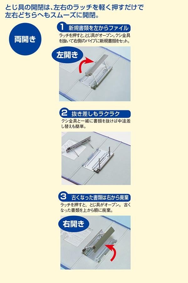 | 左右どちらからでも書類の差し替えができるファイル。 |