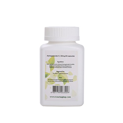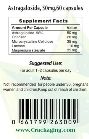 -. Binding : Health and Beauty -. Brand : Crackaging -. EAN : 0661799263009 -. Feature : #1 Cycloastragenol & Astragaloside IV brand on Amazon. We've been selling on Amazon for over 3 years. / The capsules we use have been tested by FDA. This specially designed veggie capsules can protect Cycloastragenol from being destroyed by stomach acids,leading to better absorption and effects. / Generic alternative to known Telomerase activators. / CrackAging only uses Astragaloside IV with purity over 98%, tested by independent 3rd-payty labs in US. / 100% natural ingredients, no artificial ingredients or chemical capsule coating added. -. IsAdultProduct : 0 -. Label : Crackaging Biotech. -. Manufacturer : Crackaging Biotech. -. Model : US-20 -. MPN : 9495827592 -. NumberOfItems : 1 -. PackageQuantity : 60 -. PartNumber : 9495827592 -. ProductGroup : Health and Beauty -. ProductTypeName : HEALTH_PERSONAL_CARE -. Publisher : Crackaging Biotech. -. Size : 60 capsules (Registered brand: Crackaging) -. Studio : Crackaging Biotech. -. Title : Super-Absorption Astragaloside IV 98% 50mg--- Anti-Aging Supplement -. UPC : 661799263009