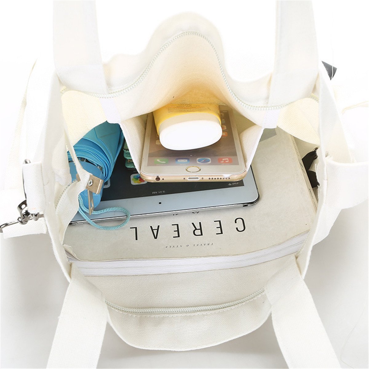 You can put A4 size files, iPad, smartphone, cosmetic pouch, cigarette, sunglasses, long wallet, folding umbrella, notebook.