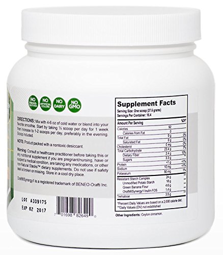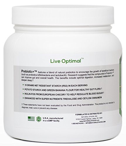 -. Binding : Health and Beauty -. Brand : Natural Stacks -. EAN : 0701698826490 -. Feature : COMPLETE PREBIOTIC SUPPLEMENT featuring resistant starch powder, green banana flour, and Inulin-FOS / PROMOTES GUT AND OVERALL HEALTH by encouraging the growth of "friendly" gut flora that maintain proper pH for optimal digestion and healthy metabolism. / HELPS REGULATE blood sugar, increase satiety, and discourage the growth of "unfriendly" bacteria / EXPERIENCE DEEPER SLEEP. Prebiotic+ increases serotonin-producing bacteria in the gut that converts to melatonin at night resulting in deeper more restorative sleep. -. IsAdultProduct : 0 -. Label : Natural Stacks -. LegalDisclaimer : These statements have not been evaluated by the Food and Drug Administration. This product is not intended to diagnose, treat, cure or prevent any disease. -. Manufacturer : Natural Stacks -. MPN : PREB -. PackageQuantity : 1 -. PartNumber : PREB -. ProductGroup : Health and Beauty -. ProductTypeName : HEALTH_PERSONAL_CARE -. Publisher : Natural Stacks -. Size : 1 lb. -. Studio : Natural Stacks -. Title : Prebiotic Plus: Resistant Starch Powder. All Natural Complex with Raw Potato Starch, Green Banana Flour and Inulin-FOS. Enhances Digestion, Metabolism and Sleep Quality. #1 Resistant Starch Supplement, Fortified with Trehalose and Ceylon Cinnamon. 454 Grams -. UPC : 701698826490