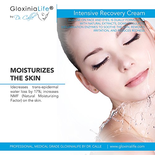 PROFESSIONAL, MEDICAL GRADE GLOXINIALIFE BY DR. CALLE INTENSIVE RECOVERY CREAM; for use on face and eyes; is dually formulated with natural extracts, down-regulates inflammation enzymes to soothe the skin, removes irritation, and reduces redness