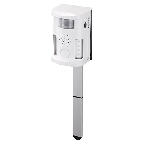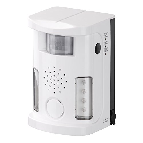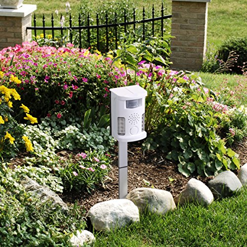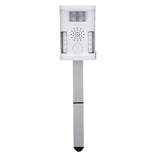 -. Feature : Keep unwanted pests away - the safe and humane way. Repellent is effective on cats, dogs, birds, deer, bears, rabbits, squirrels, skunks, bats, mice, rats, foxes, raccoons and more. / With 5 working electronic modes - ideal for protecting yards, gardens, porches, patios, basements, garages, attics, boats, ponds and farms. / Ultrasonic sound, audible sound and flashing LED lights - activated by Passive Infrared (PIR) motion sensor. 4000 sq. ft. coverage area with a motion sensor protected area of up to 600 sq. ft. / Weatherproof and water-resistant. Install using the aluminum ground stake or hang. / Mains adaptor or 9V battery operated (battery not included.)