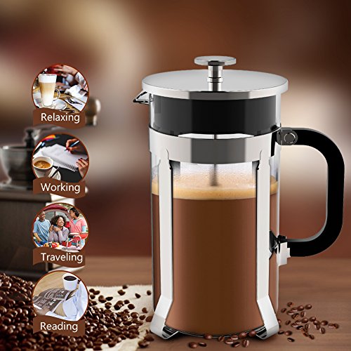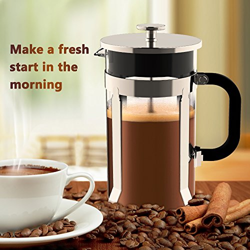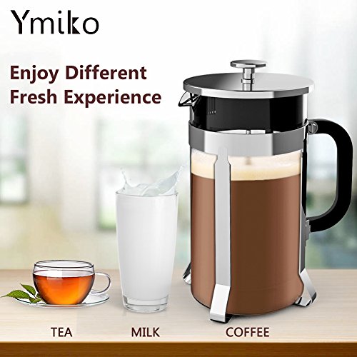 304 Grade Stainless and Heat Resistant Glass Coffee Press: Ymiko French Press built in 304 grade stainless steel can protect it from broken and FDA certificated heat resistant glass which is food grade safe ! Unique four-filter system and a secondary filter at the lid that yields a richly flavored.