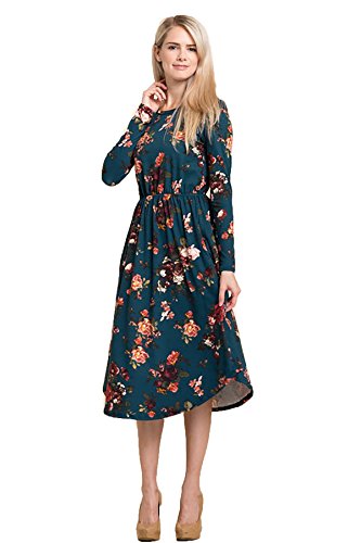 Long sleeve dress with round collar and pockets. Floral midi with ribbed gathering at the waist. Dress length is 41 inches and 37 inches on the sides. Models height is 5"9 wearing a size small. 95% Polyester, 5% Spandex. Made in U.S.A.Feature