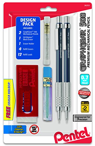 Pentel GraphGear 500 Automatic Pencil Kit, 0.7mm, Refill Leads, Block Eraser 2 Pack (PG527LEBP2)