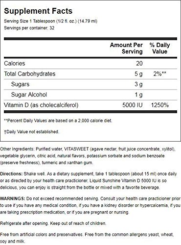 Liquid Sunshine Vitamin D3 5000 IU 16 oz LiquidProduct DescriptionFeel the Difference a Spoonful of LIQUID SUNSHINE Can Make. Just a spoonful of delicious, tropical citrus-flavored LIQUID SUNSHINE provides 5000 IU of vitamin D3, nature's most bioavailable form. Studies indicate that 5000 IU of vitamin D3 every day can help many people achieve optimal calcium absorption and support healthy bone density. Yet, according to the National Center for Health Statistics, more than 35% of Americans don't even get the minimum Daily Value (DV) of 400 IU that only serves to prevent deficiency. And recent research shows that if you're only getting the Daily Value, you're probably not getting enough for optimal health. LIQUID SUNSHINE Vitamin D3 5000 IU goes beyond the limited activity of 400 IU by providing the superior health benefits that can only be found at such high-potency levels. LIQUID SUNSHINE Vitamin D3 5000 IU