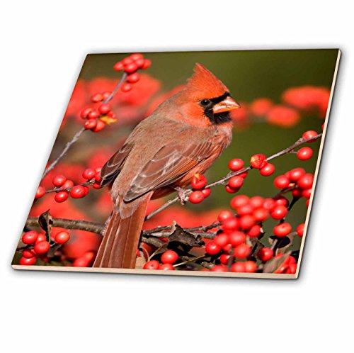 3dRose Northern Cardinal male on Common Winterberry - Ceramic Tile, 4-inch (ct_205805_1)