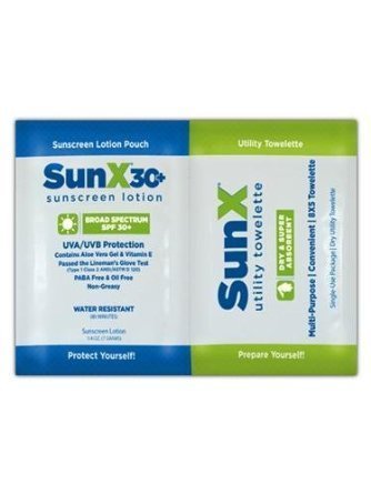 Sun X SPF 30+ Broad Spectrum Sunscreen Sun X 30+ Broad Spectrum Sunscreen Lotion Pouch meets or exceeds new FDA sunscreen monograph. It is offered in several unique applications and packaging allowing the most effective and economical skin protection program for any environment. • Contains Aloe Vera Gel & Vitamin E • Broad Spectrum Sunscreen with UVA/UVB protection • Passed the Lineman's Glove Test (Type 1 Class 2 ANSI/ASTM D 120) • Sun X is FDA rated Water Resistant with maxium allowed duration time (80 minutes). • PABA Free & Oil Free -PLUS- Sun X Multi-Pack Contains: 1 Single Use Sun X 30+ Broad Spectrum Sunscreen Lotion Pouch & 1 Single Use Dry Utility Towelette. • Multi-Purpose • Convenient • 8X5 Towelette Sun X Utility Towelette is a multi-purpose convenient, dry towelette in a single dose foil pack. It is gentle on the skin, face and hands. It is not pre-moistened and is intended to absorb sweat, dirt, sunscreen and/or other substances. 25 count.Feature