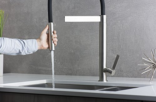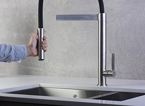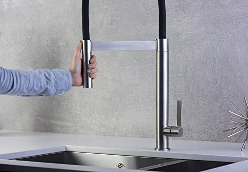 - PRO STYLE: This faucet is oversized pull-down kitchen faucet which brings a professional style into your kitchen, it will easy get the attention of everyone. Have a tall high gooseneck spout of 24 1/2 inches. You should to consider the space required for such a spout. High-arch Spout Design with 360-degree Rotation, offers more room for a variety of sink activities.