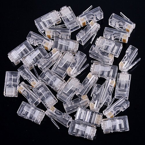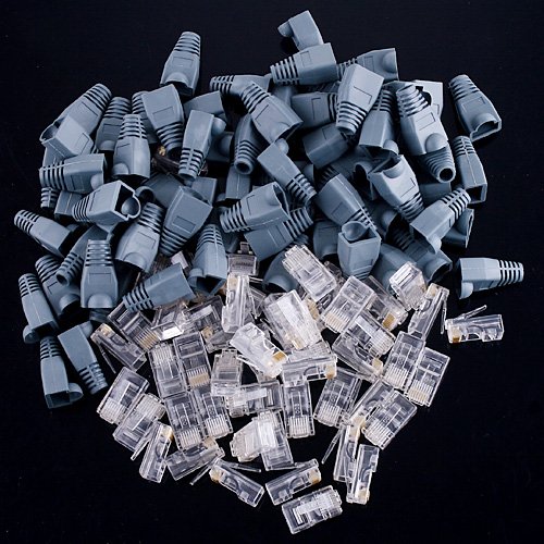 -. Feature : Features: RJ45 (8P8C) modular plugs Application for Cat5, Cat5e, Cat6 Cable Head Style: 8P8C Color: Clear plugs with gray boots/caps RJ45 Boots / Caps Provides strain relief for cable For use with solid or stranded round cable Package Included: 50* RJ45 Module Plugs 50* RJ45 Boots / Caps