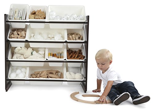 12 rugged plastic toy bins are interchangeable, 8 standard and 4 large storage containers