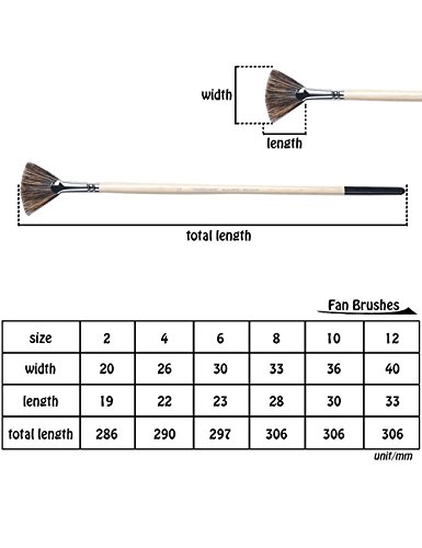 - Fan paint brushes in a variety of sizes with the width from 20mm to 40mm (#2, #4, #6, #8, #10, #12), allowing for exceptional control, great for creating soft textures for hair and backgrounds in portraiture, or for trees, grasses, bushes, clouds and highlights in landscapes