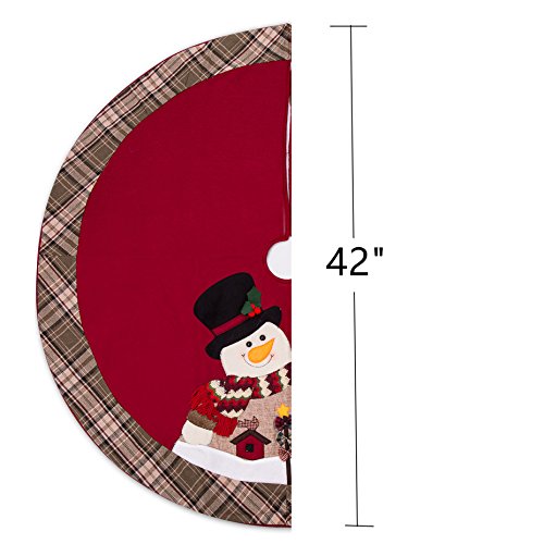 IPEGTOP 42" Christmas Tree Skirt - Xmas Tree Skirts Holiday Decoration Happy Skiing Santa & Snowman, Red Non-woven Tartan Rim