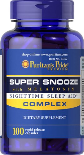 -. Binding : Health and Beauty -. Brand : Puritan's Pride -. EAN : 0025077103522 -. Feature : Melatonin works in harmony with your natural sleep cycle / Perfect for people experiencing occasional sleeplessness, those with jet lag / Anyone seeking to improve their quality of rest / Sleep aid / Key ingredients include valerian root, chamomile, passion flower and melatonin -. IsAdultProduct : 0 -. Label : Puritan's Pride -. Manufacturer : Puritan's Pride -. MPN : 10352 -. NumberOfItems : 1 -. PackageQuantity : 1 -. PartNumber : 10352 -. ProductGroup : Health and Beauty -. ProductTypeName : HEALTH_PERSONAL_CARE -. PublicationDate : 2013-01-24 -. Publisher : Puritan's Pride -. Size : 100 count -. Studio : Puritan's Pride -. Title : Puritan's Pride Super Snooze with Melatonin Rapid Release Capsules,100 Count -. UPC : 025077103522