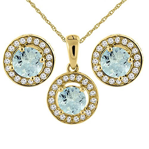 -. Title : 14K Yellow Gold Natural Aquamarine Earrings and Pendant Set with Diamond Halo Round 5 mm