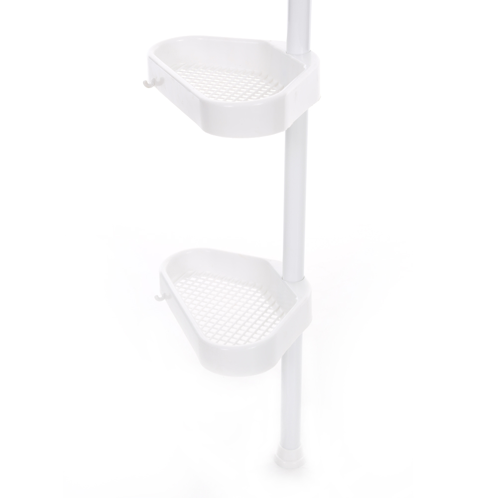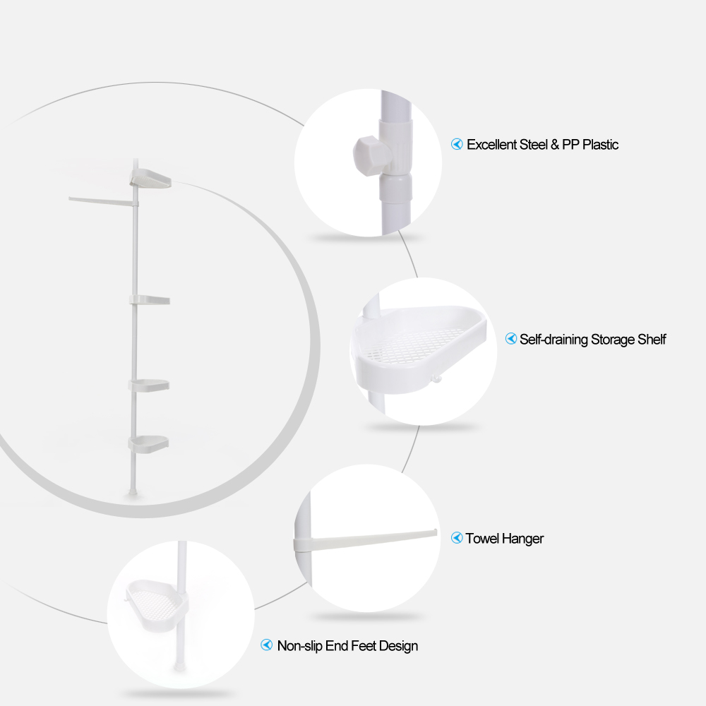 This metal corner shower caddies is a great tool to organize your bathroom or shower. Made of high-quality iron, powder-coated, sturdy & anti-rust. Stable to use with 180cm height adjustable and non-slip feet. Space-saving design, 4 self-draining shelf and 2 towel/cloth hanger to conveniently to hold body washes, shampoo, soap, hair conditioner, light cloth, towel. You really cannot miss this shower caddy!