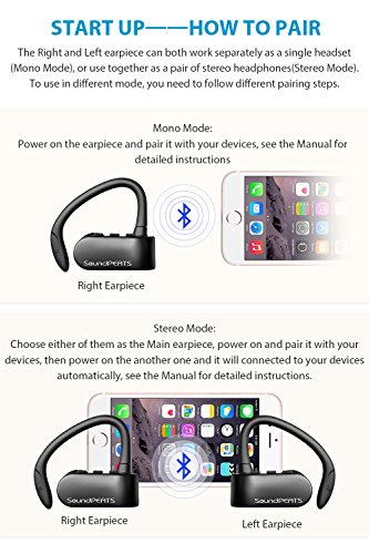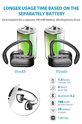 -. Feature : ¡¾Truly Wireless¡¿: Now you can enjoy the Real True Wireless headset,which will set you free from the long cable and busy hands. Cable-free also means no more worries about the cord bouncing, tapping, or rubbing on something. It also means no more noise when you move, and no more cords stuck to your neck when you sweat. / ¡¾Stereo Mode/Mono Mode ¡¿: The headset contains two pieces which can be used separately by you and someone you want to share it with, meaning you can share the same music/movies/TV(within reasonable distance), and can enjoy the stereo sound by using both earpieces. You can also use one of them, and enjoy the music world with just one earpiece. / ¡¾Secure Fit and Sweatproof¡¿: With the secure fit earhook, you don't need to worry about its falling out of your ear, and is perfect for working out because of the sweatproof feature. You can also enjoy the hands-free calling with the built-in microphone function. / ¡¾Advanced Bluetooth 4.2 and Two Separately Battery¡¿:Bluetooth 4.2 Technology lets you enjoy the Frequent High-Fidelity Super Clear Sound, and with the CSRA64210 Bluetooth Chipset, you can enjoy fast speed and stable connectivity. Two separate batteries makes the usage time longer; you can enjoy 6 hours working time on each earpiece. / ¡¾One-Year Warranty¡¿:We warrant this device 12 MONTHS from date of the original purchase for manufacturer defects. If the device fails due to a manufacturing defect, please contact seller directly to initiate return and warranty process.