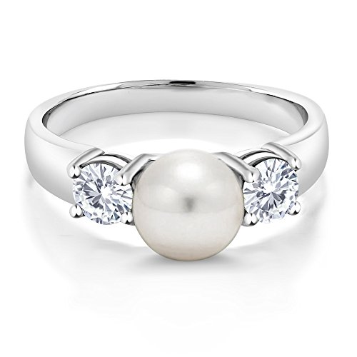 -. Title : 925 Sterling Silver Three-stone Cultured Freshwater Pearl and 0.58 ct Created Moissanite Ring (Available in size 5, 6, 7, 8, 9)