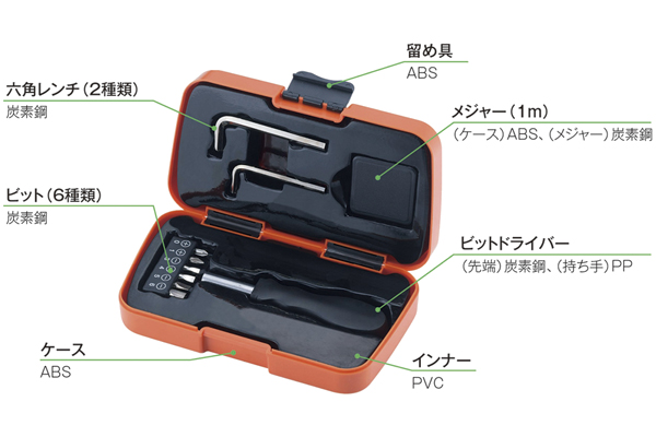 ●材質:メジャー(1m)/炭素鋼、ケース/ABS、六角レンチ(2種類)・ビット(6種類)/炭素鋼、ビットドライバー(先端)/炭素鋼、ビットドライバー(持ち手)/ポリプロピレン、ケース・留め具/ABS、インナー/PVC