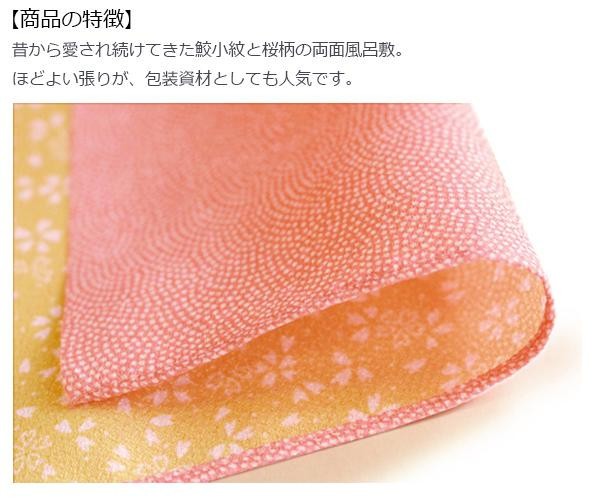 fk094igrjs昔から愛され続けてきた鮫小紋と桜柄のリバーシブル風呂敷です サイズ 約90cm 個装サイズ:2.1×23.8×16.3cm 重量 個装重量:114g 素材・材質 ポリエステル100%(ポリエステルアムンゼン) 仕様 対応のしサイズ:B5 縫製:天地ミシン 生産国 日本 包装資材としても人気のリバーシブルタイプの風呂敷 ※画像は、左側が表面、右側が裏面になっております ※モニターの設定などにより、実際の商品と色味や素材の見え方が異なる場合がございますあらかじめご了承ください 【洗濯方法】 ・液温は40度を限度とし、洗濯機で洗濯処理ができる ・塩素系及び酵素系漂白剤の使用禁止 ・底面温度150度を限度としてアイロン仕上げができる(あて布使用) ・日陰の吊干しがよい 昔から愛され続けてきた鮫小紋と桜柄のリバーシブル風呂敷です