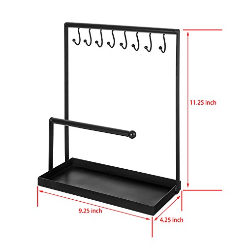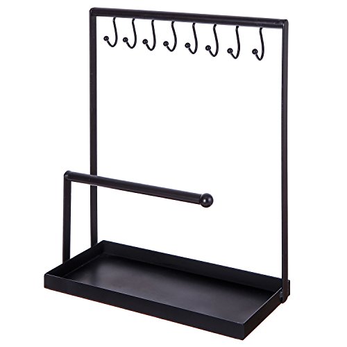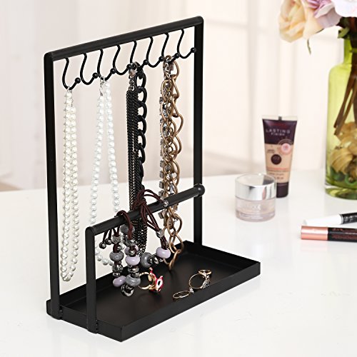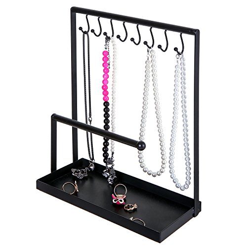 -. Title : Metal Jewelry Display Rack, 8 Hook Necklace & Bracelet Holder with Ring Tray, Black