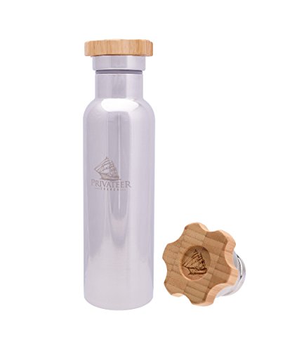 Insulated Stainless Steel Water Bottle with 'Captains Wheel' Bamboo Lid - Mirror Finish and 20 oz Capacity