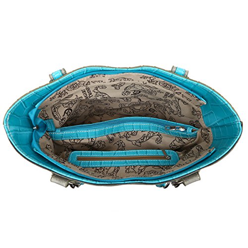 Made from high quality faux/imitation turquoise PU leather decorated with silvertone hardware, rhinestones, large silvertone cross decorated with imitation turquoise stones, and white embroidered wings on the front of the bag