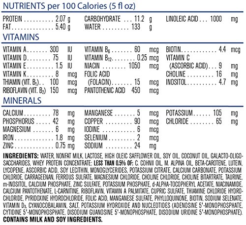 Water, Nonfat Milk, Lactose, High Oleic Safflower Oil, Soy Oil, Coconut Oil, Galactooligosaccharides, Whey Protein Concentrate, Less than 0.5% of:, C. Cohnii Oil, M. Alpina Oil, Beta-Carotene, Lutein, Lycopene, Ascorbic Acid, Soy Lecithin, Monoglycerides, Potassium Citrate, Calcium Carbonate, Potassium Chloride, Carrageenan, Ferrous Sulfate, Magnesium Chloride, Choline Chloride, Choline Bitartrate, Taurine, m-Inositol, Calcium Phosphate, Zinc Sulfate, Potassium Phosphate, d-Alpha-Tocopheryl Acetate, Niacinamide, Calcium Pantothenate, L-Carnitine, Riboflavin, Vitamin A Palmitate, Cupric Sulfate, Thiamine Chloride Hydrochloride, Pyridoxine Hydrochloride, Folic Acid, Manganese Sulfate, Phylloquinone, Biotin, Sodium Selenate, Vitamin D3, Cyanocobalamin, Salt, Potassium Hydroxide, Nucleotides (Adenosine 5�-Monophosphate, Cytidine 5�-Monophosphate, Disodium Guanosine 5�-Monophosphate, Disodium Uridine 5�-Monophosphate)