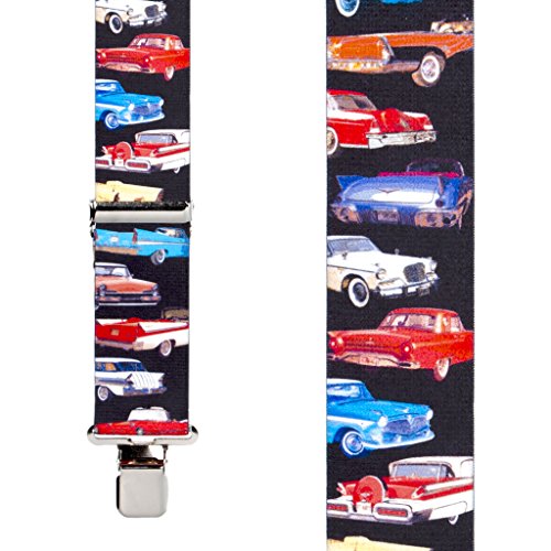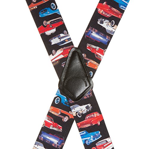 Binding : Apparel Product Description Pay tribute to the nifty fifties with these Class of '57 vintage car themed elastic suspenders. 2 inches wide with leather crosspatch and heavy duty construction clips. Available in 3 sizes to ensure a perfect fit. For adults of average build the 42-inch length will fit folks 5' - 5'8" tall; the 48-inch length will fit people 5'8" - 6'1"; and the 54-inch length will fit persons 6'1 - 6'5". If in doubt choose the larger size as suspenders can be shortened but not lengthened. 0