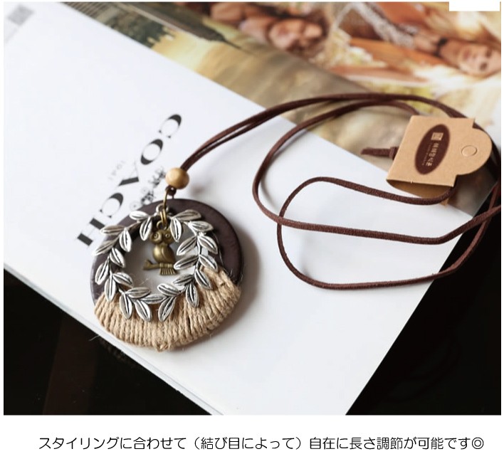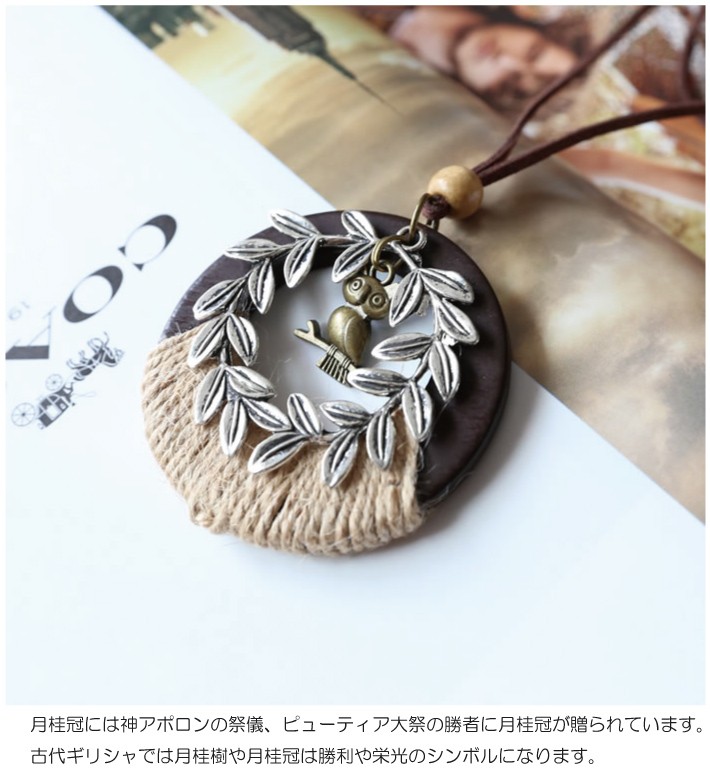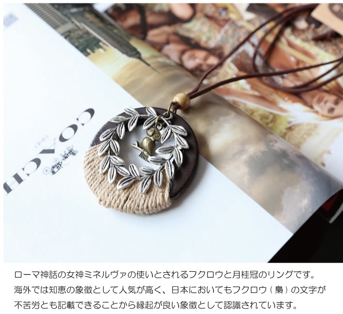 ☆ローマ神話の女神ミネルヴァの使いとされるフクロウと月桂冠のリングです。海外では知恵の象徴として人気が高く、日本においてもフクロウ(梟)の文字が不苦労とも記載できることから縁起が良い象徴として認識されています ★Tシャツやブラウス、セーター、長めでシンプなコーディネートにもアクセントになるアイテム。 ★スタイリングに合わせて(結び目によって)自在に長さ調節が可能です。 ★自分用にも気軽なプレゼントにも喜ばれる小物です。 ★☆胸元でゆらゆら存在感ばっちりです誕生日プレゼントや女の子への贈り物にいかがですか? |