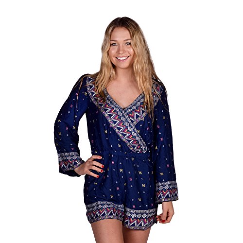 Product DescriptionShort romper with border print, surplice front neckline, and bell sleeves.0
