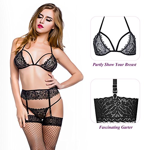 -. Title : Utimi Women Four-piece Sexy Lingerie Set Lace Sleepwear Enticing Nightwear with Bra, Waist Strap, G String and Net Stockings