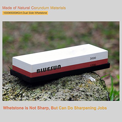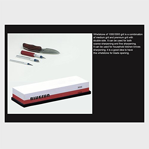 - •✅2 GRIT SIDES ENSURE BEST SHARPENING: The BLUESUN Sharpening Stone Device has excellent features of self-sharpening, particle distribution is consistent and precise hardness. The 1000 grit side is for re-profile cutting edge of knife, refine the dull edge of blade and damaged gap of blade quickly, the 3000 grit side is for fine grinding, remove the burr and straighten the cutting edge of knives quickly, enhance the edge to be sharp and polished.