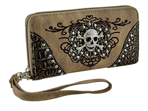 Studio : Zeckos Publisher : Zeckos Binding : Apparel Product Description With a rhinestone covered skull and crossbones on the front, this wallet shows off your fashionably rebellious side, and features chrome dome and pyramid studs, metallic mock croc trim, and a removable 1/4 inch wide, 6 inch long wrist strap. This 7.5 inch long, 4 inch high, 1 inch wide (19 X 10 X 3 cm) skull wallet includes 12 card slots, 3 slip pockets and 1 zippered change pouch inside the polyester lined interior, and it secures with a wrap around zipper. 0