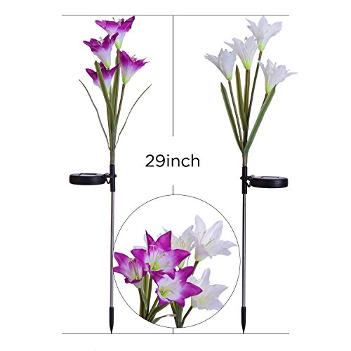 LILY FLOWER SOLAR LIGHT. 2 Pack beautiful artificial flower garden stake lights(Include purple and white lily lights). The flowers petal is exquisitely designed to imitate real lily flower. If you want to make your garden colorful, these unique solar lights will bring you the solar garden light decoration solution.