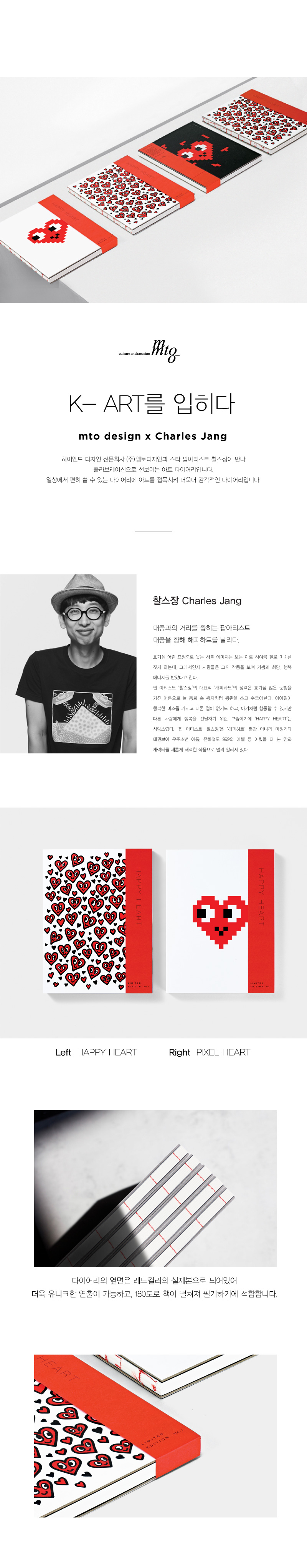 | 팝아티스트 찰스장작가의 HAPPY HEART by MTO Design 대중과의 거리를 좁히는 팝아티스트 ‘찰스장’의 대표작 ‘해피하트’의 성격은 호기심 많은 눈빛을 가진 어른으로 늘 동화 속 왕자처럼 왕관을 쓰고 수줍어한다. 아이같이 행복한 미소를 가지고 때론 철이 없기도 하고, 아기처럼 행동할 수 있지만 다른 사람에게 행복을 전달하기 위한 모습이기에 ‘HAPPY HEART’는 사랑스럽다. 이번 콜라보레이션에서는 찰스장의 대표 그림뿐만 아니라, ‘HAPPY HEART’를 ‘픽셀화’하여 유니크하면서도 강렬한 색감을 연출하였다. |