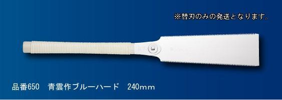 細巾でバランスは良く、片刃鋸感覚で手軽に使用できます。 製造国:日本 素材・材質:レザーソーオリジナル特殊鋼 商品サイズ:刃長:240mm、板厚:0.5mm 仕様:ピッチ:1.7mm(寸18枚目)、用途:一般木材 セット内容:替刃2枚 ※サプライヤー直送品 ご注文後2~3営業日後の出荷となります【商品名】玉鳥 青雲作ブルーハード替刃2枚セット S650