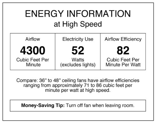 Airflow: 4,300 cfm; Energy Usage: 52 watts without light; Airflow Efficiency: 82 cfm per watt