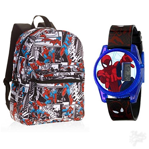 -. Feature : All-over graphics of various characters from the classic Spider-Man comic strip / Two adjustable padded shoulder straps / Quartz movement with digital display / Round watch in Spider-Man motif featuring flashing lights and sound / 34.82 mm plastic case with plastic dial window
