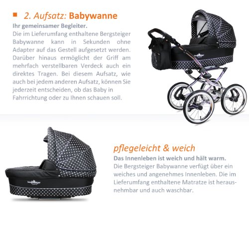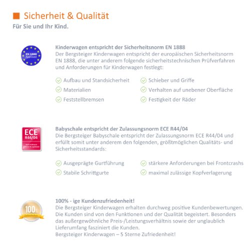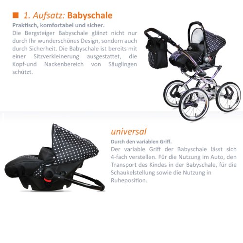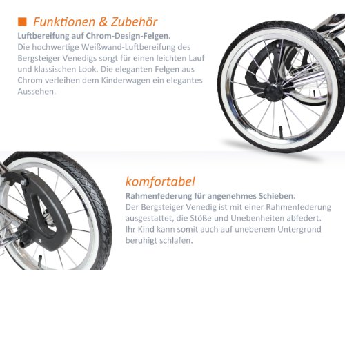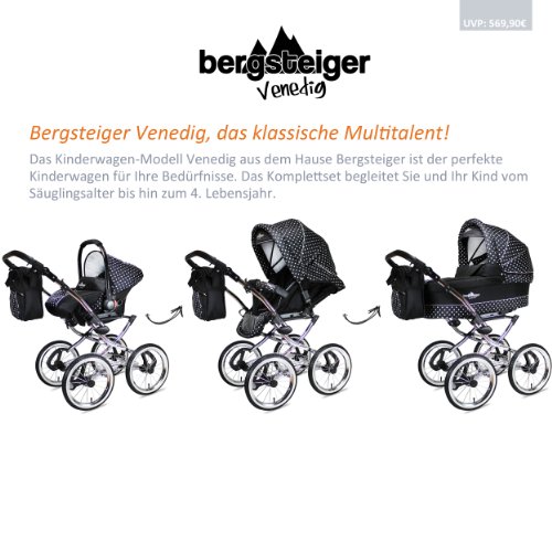 -. Binding : Babyartikel -. Brand : Bergsteiger -. Feature : Riesiges Kinderwagenset aus dem Hause Bergsteiger. Dieses Paket lässt keine Wünsche offen und wird Sie und Ihr Kind vom Säuglingsalter an begleiten. Enthalten sind sowohl eine Babyschale (für das Auto), eine Babywanne und ein Sportsitz (By). Die einzelnen Aufsätze lassen sich in sekundenschnelle wechseln. Die ausgeklügelte Konstruktion ist leicht zu bedienen. Durch das geringe Gewicht und Größe können Sie diesen Kinderwagen sehr einfach im Auto verstauen. / Sicherheit hat Vorrang! Mit diesem Kombikinderwagen sind Sie immer auf der sicheren Seite. Der Bergsteiger Kinderwagen erfüllt die europäische Sicherheitsnorm EN1888. Diese legt sicherheitstechnische Anforderungen in Bezug auf Materialien, Aufbau und Standsicherheit fest. Die Babyschale entspricht zudem der Zulassungsnorm ECE 14/04 und erfüllt somit allen Qualitäts- und Sicherheitsstandards für Kinder-Rückhaltesysteme. / Klassisches Design - moderne Konstruktion. Dieser Bergsteiger Kinderwagen ist nicht nur äußert flexibel einsetzbar, sondern ist auch ein absoluter Blickfänger. Das aparte Nostalgie-Design in Verbindung mit den Weißwand-Luftreifen auf den Chrom-Speichenfelgen sorgt für eine wunderschöne Optik. / Geniales Preis- / Leistungsverhältnis. Die Kinderwagen von Bergsteiger bieten außergewöhnliche Ausstattung und Qualität bei einem fairen Preis . Nicht ohne Grund erfreuen sich diese Kinderwagen immer größerer Beliebtheit. Die Resonanz anderer Kunden ist äußerst positiv. / Top Service - keinerlei Risiko. Sollte dann doch etwas nicht nach Ihren Vorstellungen sein, steht ein kompetentes Team Ihnen auch nach dem Kauf immer zur Verfügung. Die Beschaffung von Verschleißteilen wie Schläuche oder Reifen ist kein Problem. Dieser Kinderwagen wird Sie zufriedenstellen - garantiert! -. Label : Bergsteiger -. Manufacturer : Bergsteiger -. ProductGroup : Baby -. ProductTypeName : BABY_PRODUCT -. Publisher : Bergsteiger -. Studio : Bergsteiger -. Title : Bergsteiger Venedig Nostalgie Kombikinderwagen 3-in-1 - System; Autositz; (Megaset 10 - teilig)
