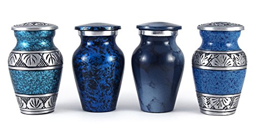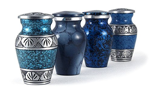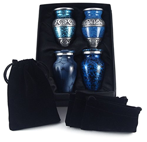 What to Expect from Our Mini Keepsake Urn Set Order You will receive a set of 4 small keepsake urns in blue and green with silver bands or engravings. Each of the 4 urns has a unique design. The set comes in a premium black display case with satin fabric finish inside. Plus you will get 4 premium velvet drawstring pouches to protect your urns when you travel with them.