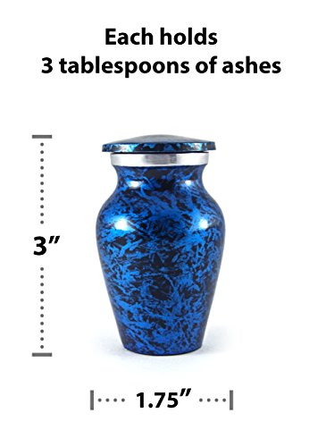 Each urn is 3 inches tall, 1.75 inches in diameter at its thickest part, and hold 3 cubic inches or 3 tablespoons of ashes, which represents about 3 pounds of human body weight. Our keepsake urns are perfect for sharing small amount of cremains of your loved one among family and friends.
