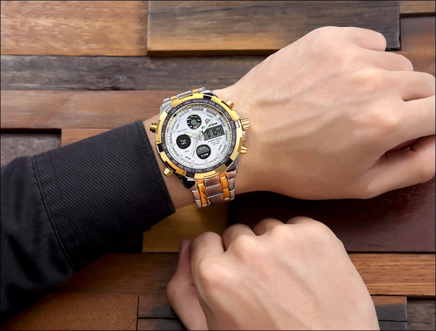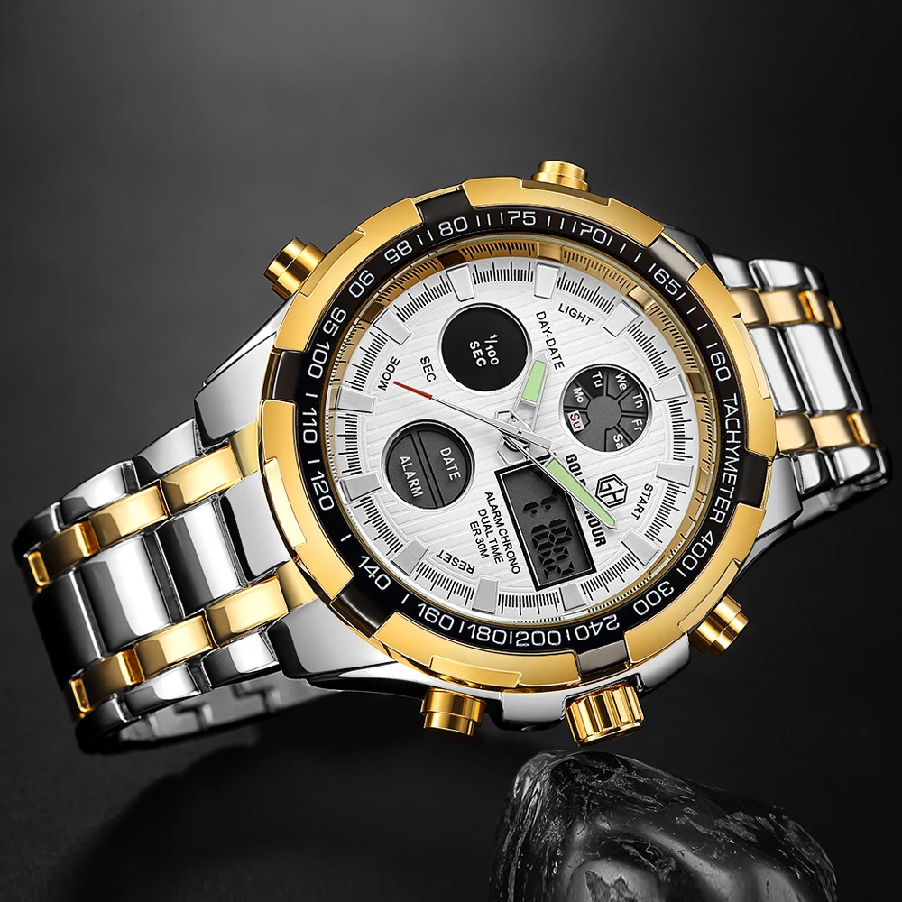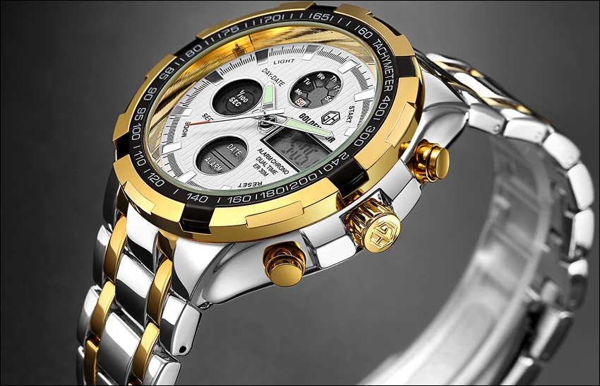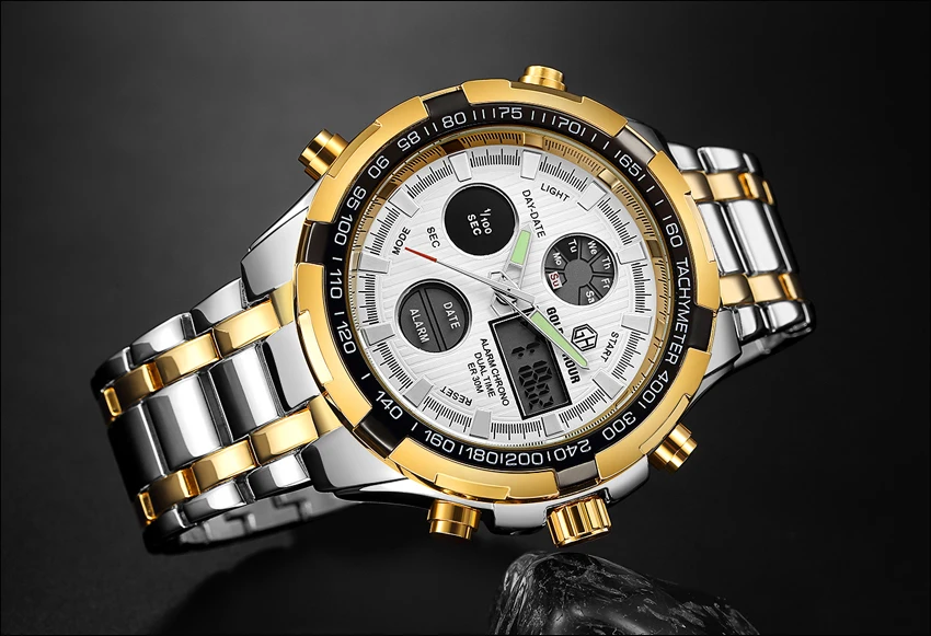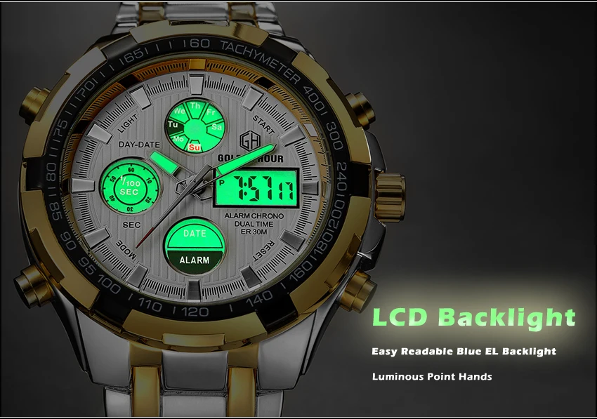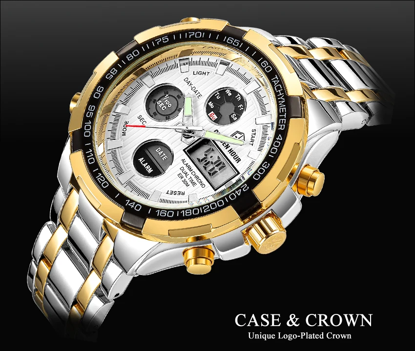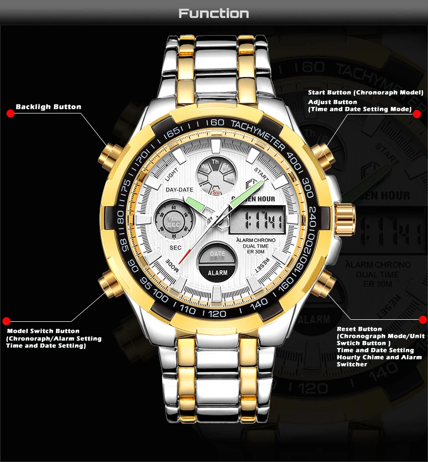 Feature:Water Resistant,LED display,Stop Watch,Back Light,Shock Resistant,Luminous Hands,Auto Date,Week Display,Alarm,Repeater