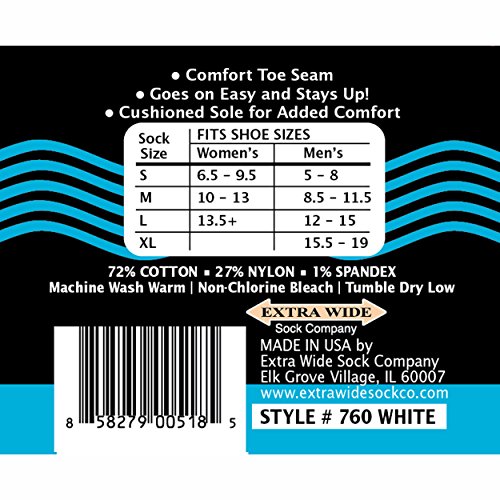 Binding : Apparel Product Description Product Description Who Are They For? If you have a regular size foot or an extra wide foot up to 5E, and are so tired of tight socks that squeeze your feet and leave huge indentations on your ankles then these quarter socks are for you. Design Features and Benefits 1. 25% wider in the foot and ankle - These socks have a more relaxed fit without binding and constricting, and are also ideal for those with sensitive feet and minor edema. The incredible design hugs your feet loosely, but still stays up. The socks won't bunch up in your shoes. These are Athletic Socks, NOT a lightweight Dress Sock. 2. Ring toe closure design provides a seam-free feel and minimizes harmful ridges that can irritate skin and cause friction, chafing or blistering. 3. Padded cushion on the bottom of the foot provides comfort with every step. If you stand on your feet all day, these socks are for you! 4. Perfect blend of cotton (72%), nylon (27%) and spandex (1%) for ultimate comfort and durability. 5. Engineered and manufactured in the USA . How Do They Fit? Style: Quarter (Above Ankle Bone) Color: White and Black Sizes: Small, Medium, Large and X-Large Small: Women's Shoe Sizes 6.5-9.5; Men's Shoe Sizes 5-8 Medium: Women's Shoe Sizes 10-13; Men's Shoe Sizes 8.5-11.5 Large: Men's Shoe Sizes 12-15 Extra Large: Men's Shoe Sizes 15.5-19 Care Instructions Machine wash warm, non-chlorine bleach, tumble dry. 0